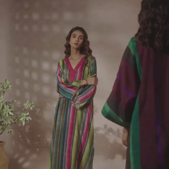 An abstract-printed kurta set in rich fall tones, paired with solid purple pants. Striking and versatile, it’s a statement piece that transitions seamlessly into the season.