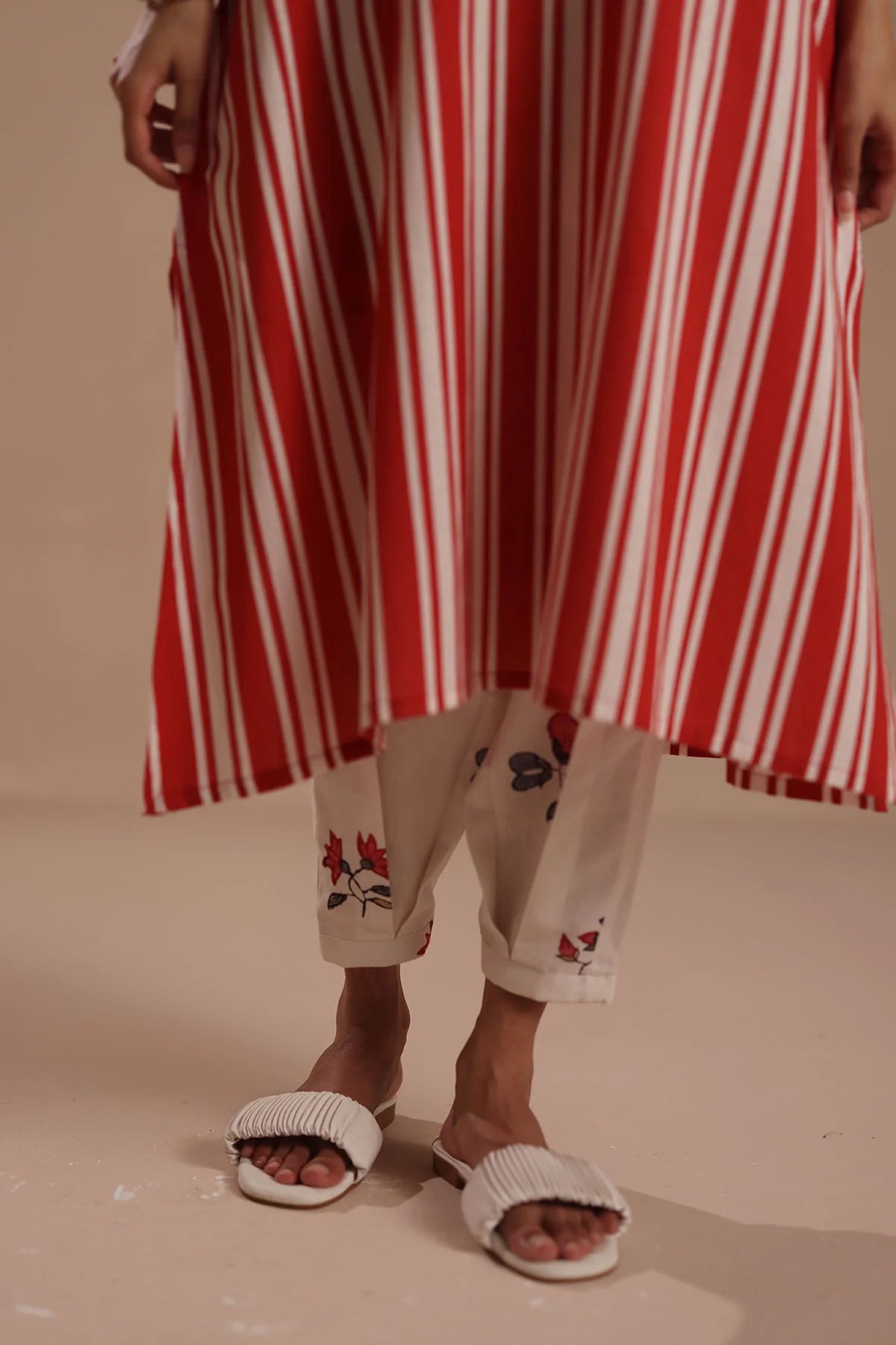 Crafted in linen, this Kurta set features bold red and white stripes complemented by a beautifully detailed yoke inspired by Mughal artistry. The design pays homage to Indian heritage through its rich palette and timeless motifs, offering a versatile silhouette that transitions seamlessly from everyday wear to festive occasions. It comes with printed Beige box pleat bottoms, that add just the right fit to the entire look.