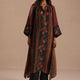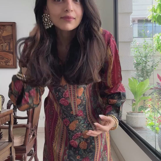 A cotton kurta set with multicolored vertical panel prints, a round neckline with buttoned yoke, and contrasting cuffs designed in maroon and yellow tones for a rich, statement look.