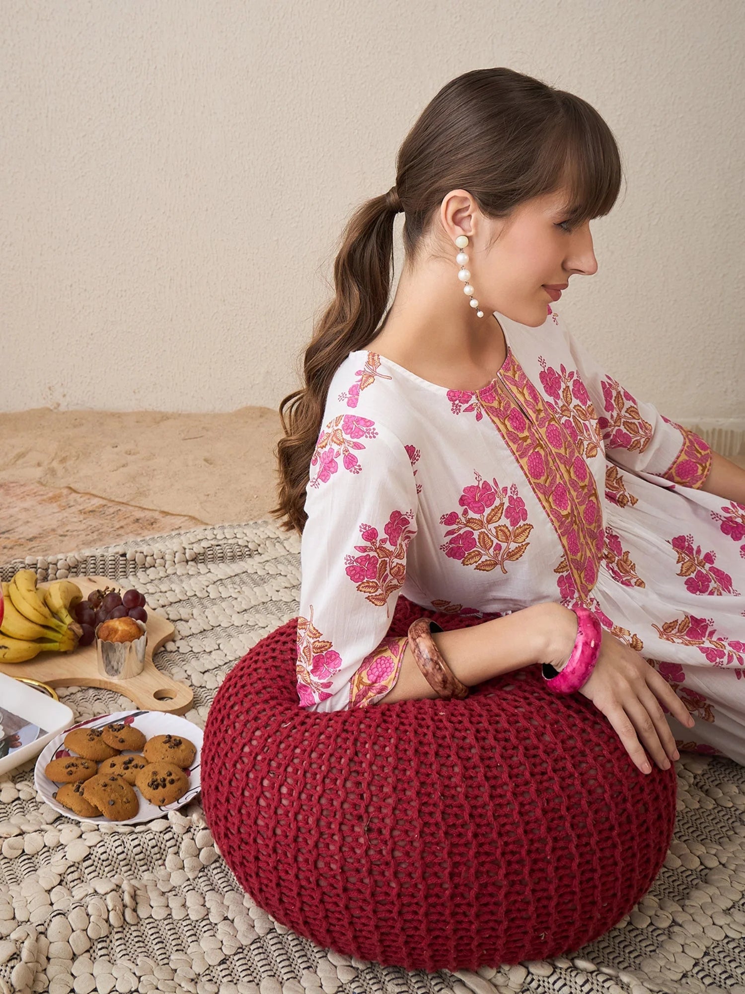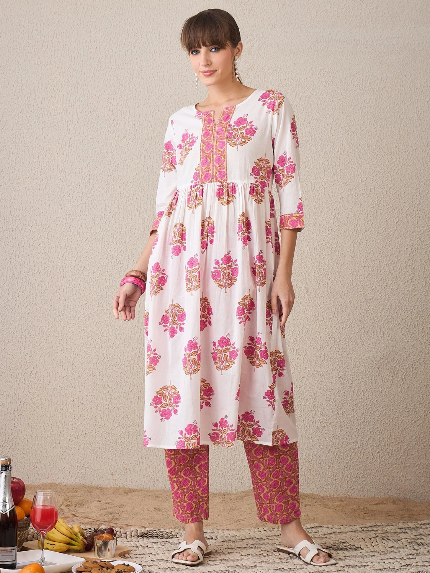 White & Pink Floral Handblock Printed Cotton Kurta Set